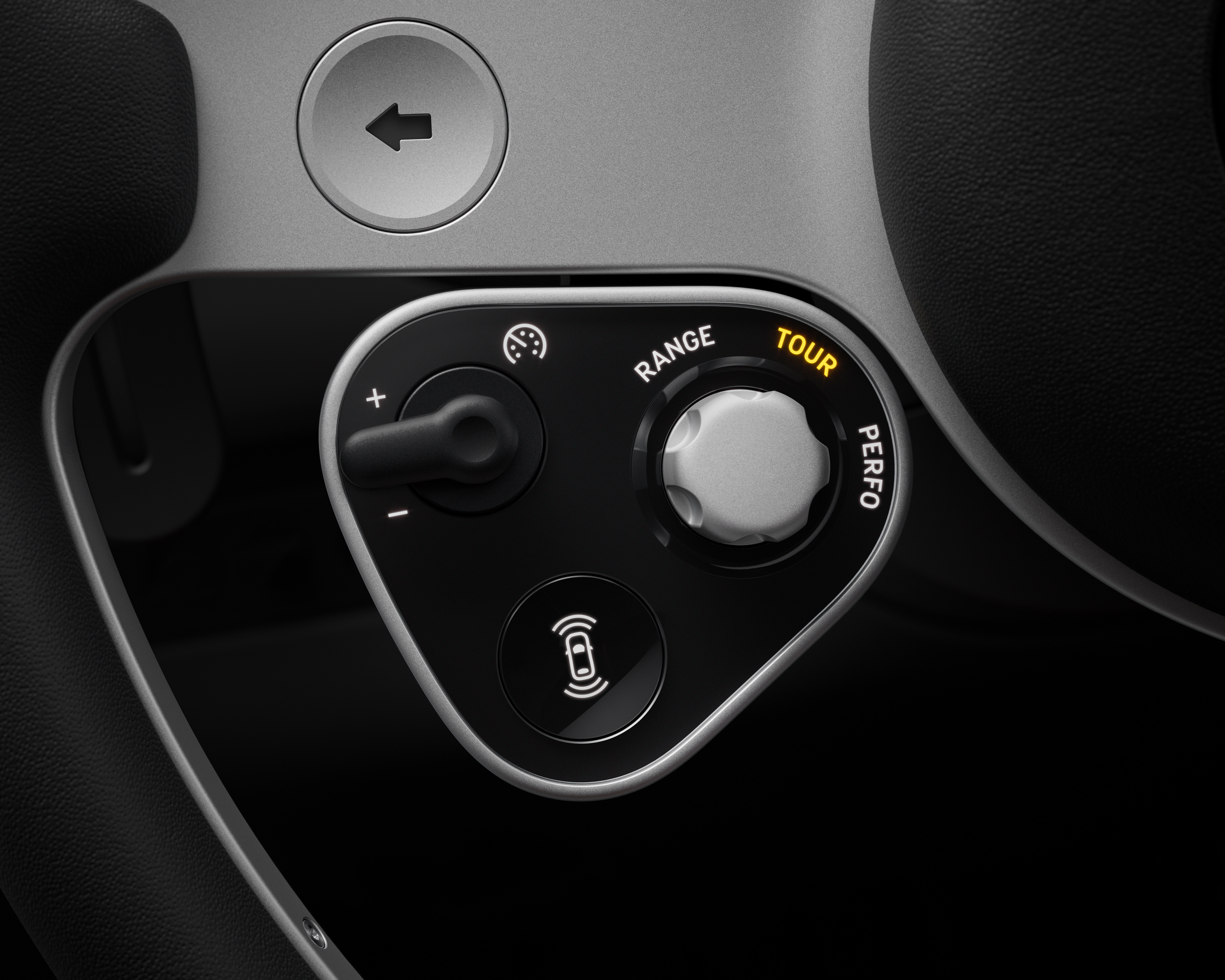 Το τιμόνι παραπέμπει στα ’60s: λεπτές ακτίνες, εκτεθειμένο αλουμίνιο και έμπνευση από κλασικά μονοθέσια της F1. Είναι ελαφρύτερο από τα συνηθισμένα και γεμάτο χειριστήρια για να αποφεύγεται η εξάρτηση από την οθόνη.