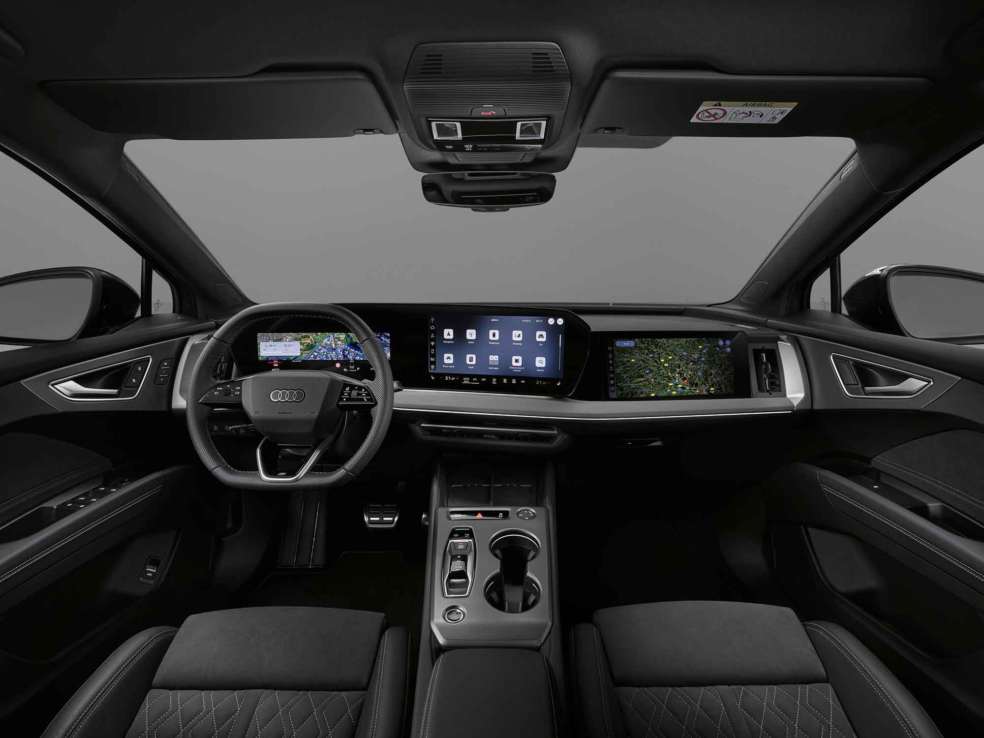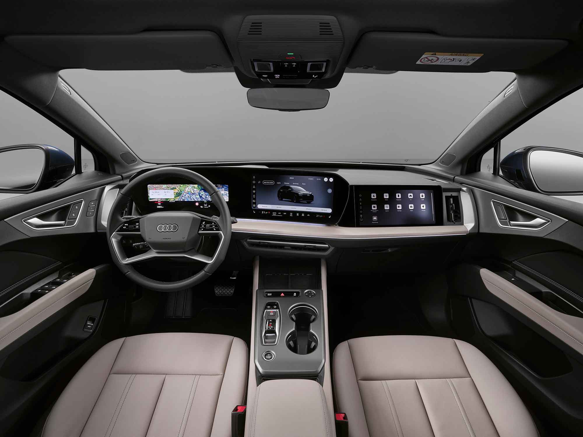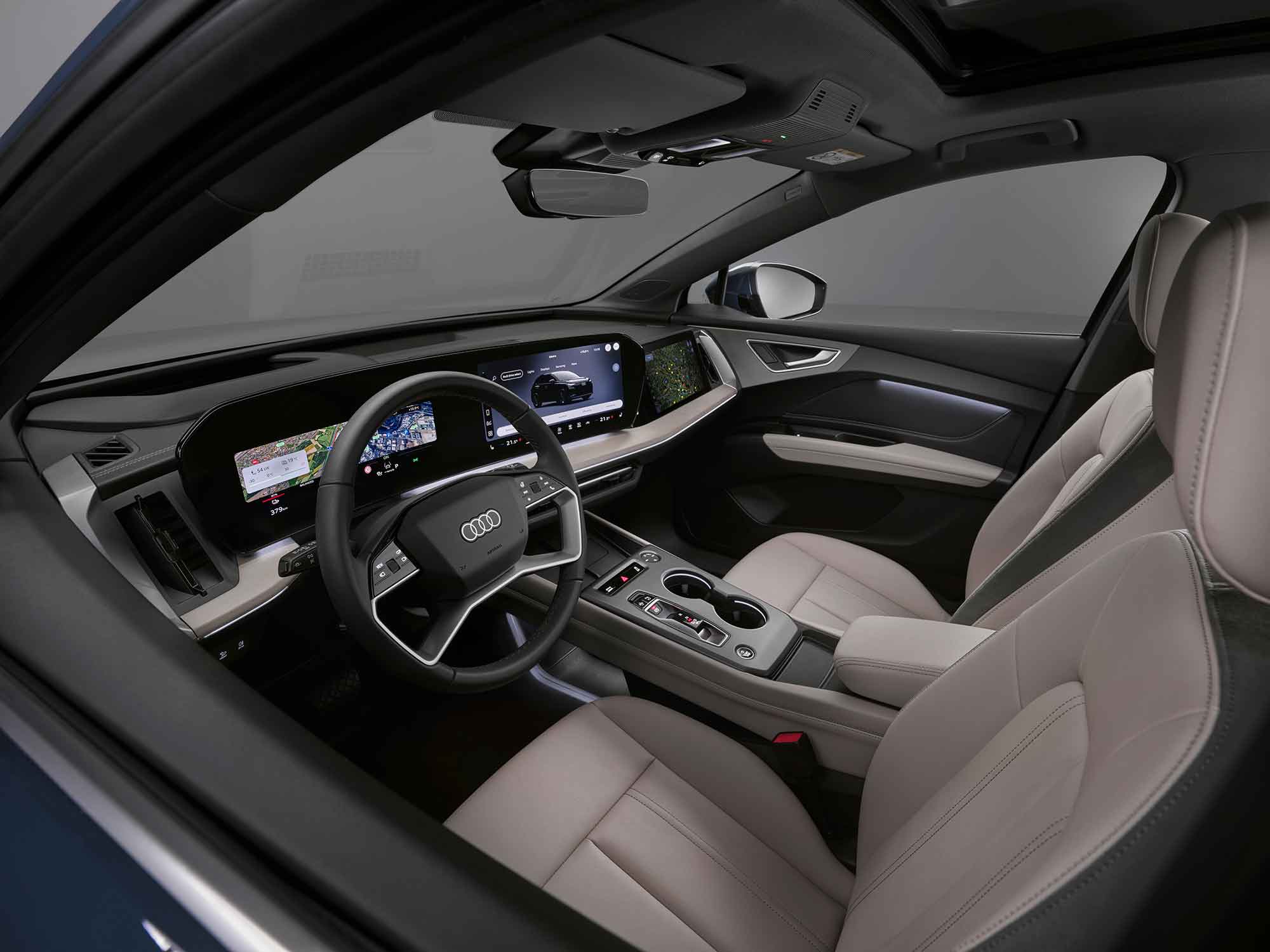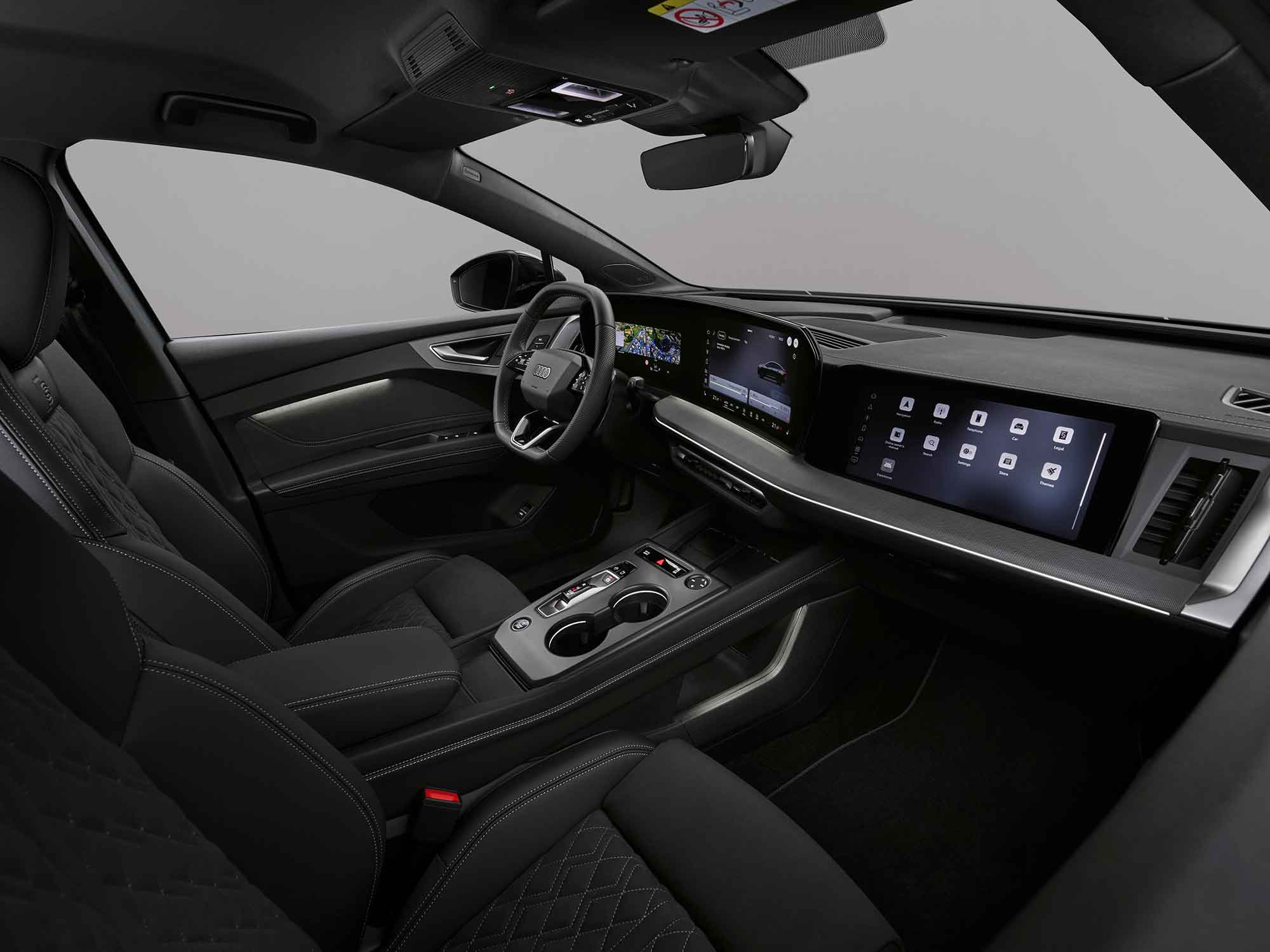 Στο εσωτερικό, το αναβαθμισμένο Q4 e-tron κάνει ένα σημαντικό άλμα σε επίπεδο άνεσης, τεχνολογίας και ποιότητας. Στο επίκεντρο βρίσκεται το νέο digital stage, με πανοραμική διάταξη οθονών που συνδυάζει πίνακα οργάνων 11,9 ιντσών και MMI touch display 12,8 ιντσών. Η οθόνη MMI διαθέτει μεγάλα πλακίδια, ώστε οι λειτουργίες και οι υπηρεσίες να είναι άμεσα ορατές και εύκολα προσβάσιμες.