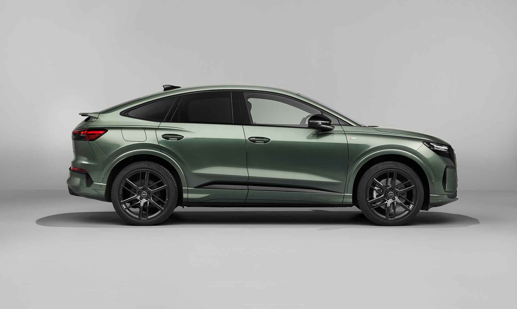 Στο Q4 SUV e-tron, η αεροτομή οροφής ολοκληρώνει οπτικά την πίσω κολόνα. Μια μαύρη διακοσμητική γραμμή κατά μήκος της οροφής διαχωρίζει οπτικά το πίσω τμήμα της οροφής από το αμάξωμα, δημιουργώντας την αίσθηση αιωρούμενης οροφής και ενισχύοντας τη δυναμική παρουσία του μοντέλου. Οι οριζόντιες γραμμές πίσω τονίζουν το πλάτος του αμαξώματος, ενώ η νέα πίσω αεροτομή και ο ανασχεδιασμένος, ψηλά τοποθετημένος διαχύτης προσθέτουν πιο σπορ χαρακτήρα. Τρεις νέες εξωτερικές αποχρώσεις και πέντε νέα σχέδια ζαντών προσφέρουν περισσότερες δυνατότητες εξατομίκευσης.