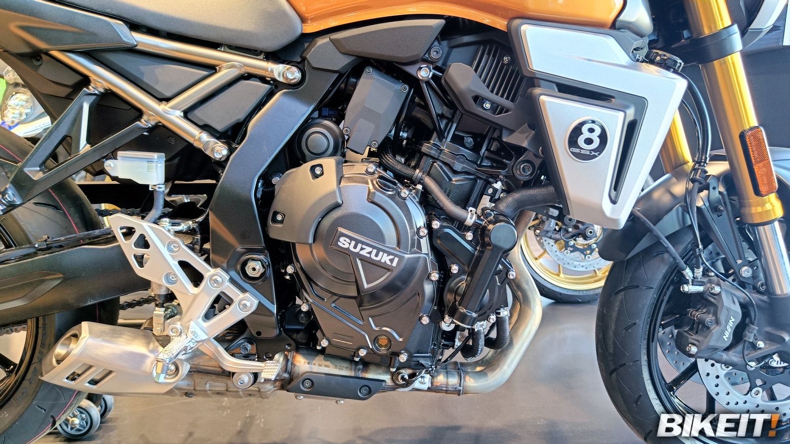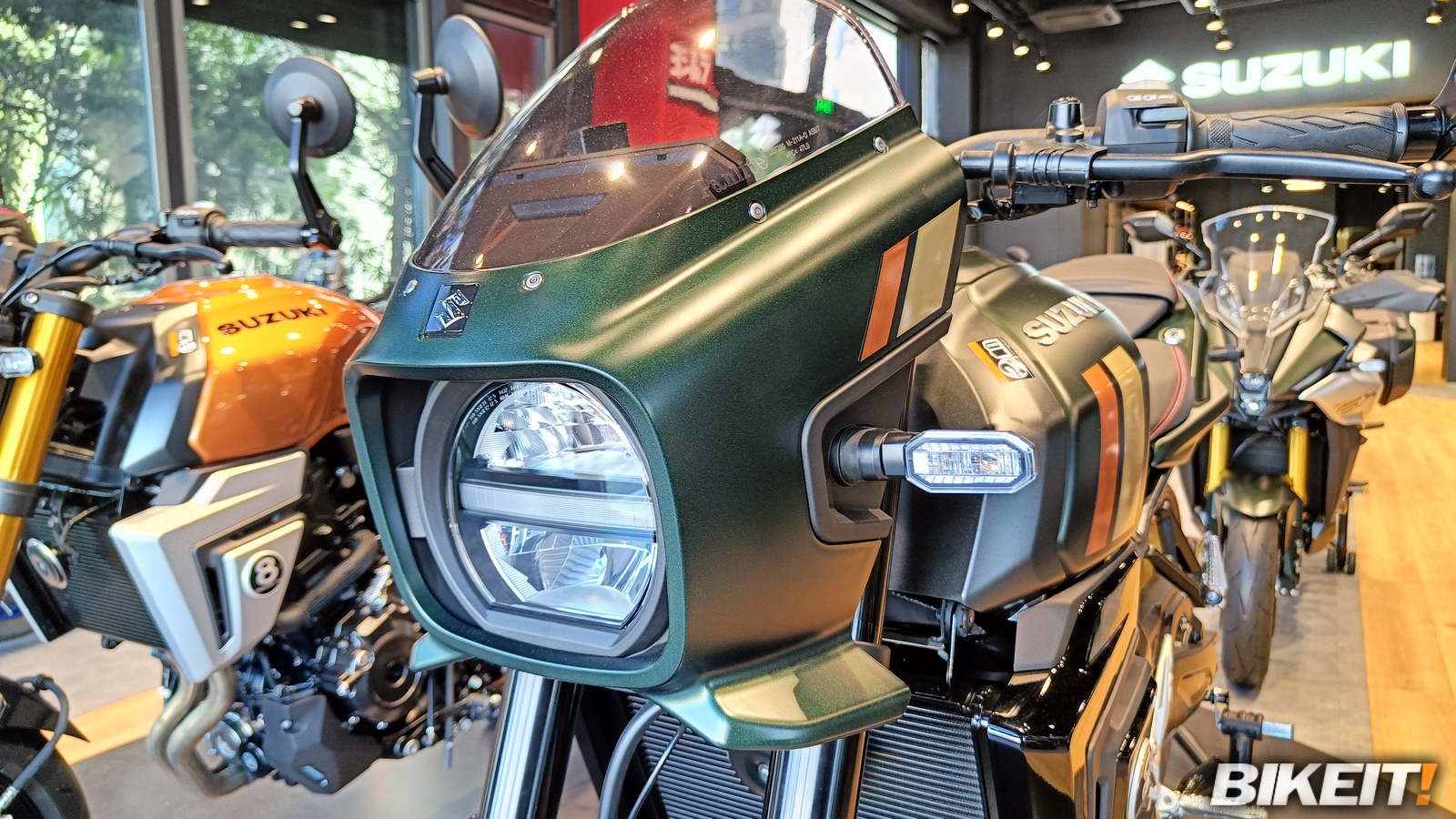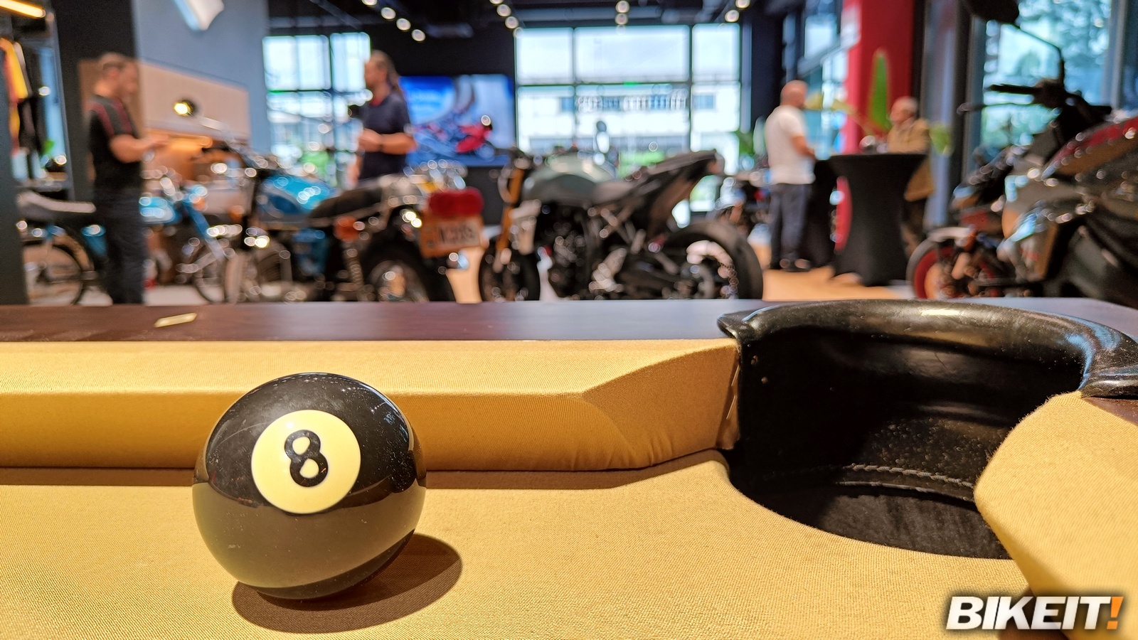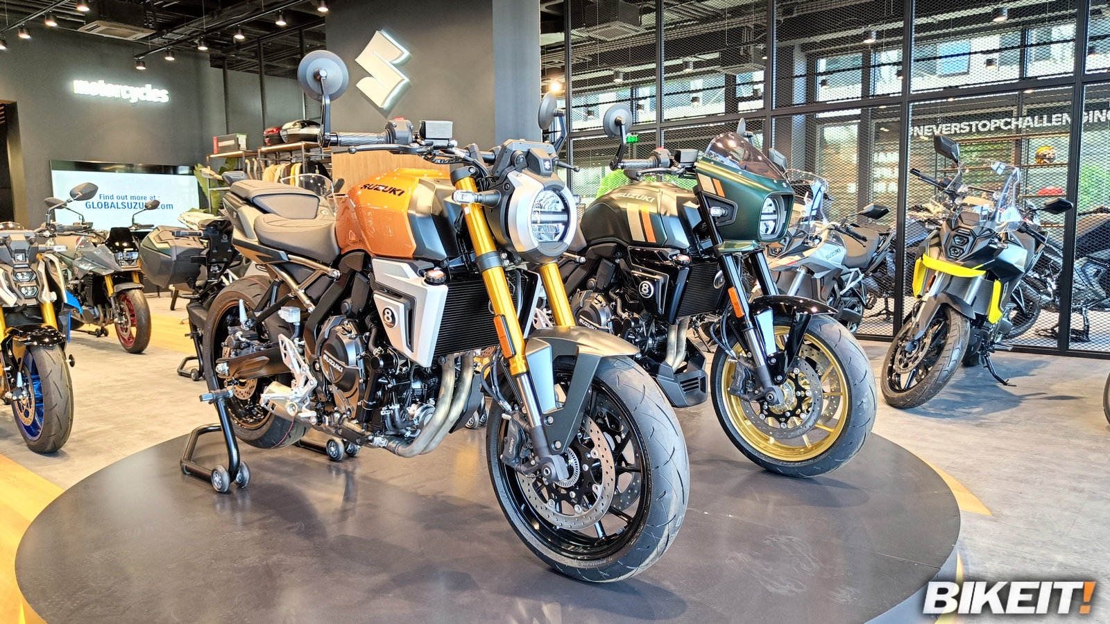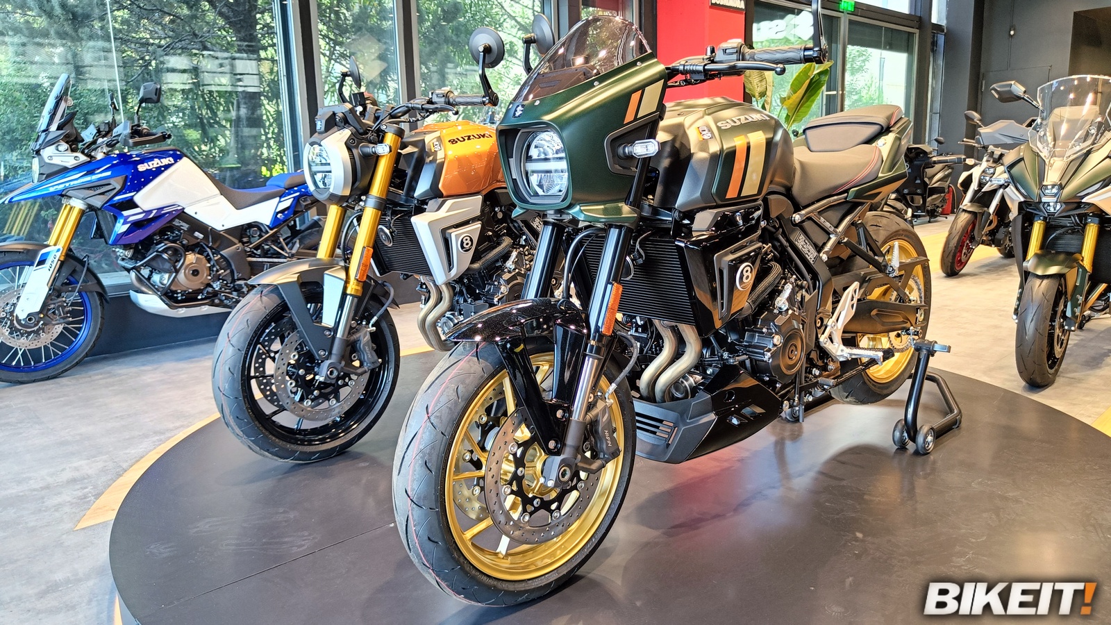 Η Suzuki μπόρεσε να εξασφαλίσει όλες τις χρωματικές επιλογές στις οποίες θα γίνουν διαθέσιμα τα νέα GSX-8T και 8TT - συνολικά 5 στον αριθμό - και να τις έχει προς επίδειξη στο κατάστημα. Το έξυπνο στιλιστικό στοιχείο του κυκλικού εμβλήματος με το 8, που θυμίζει τη μαύρη μπίλια του μπιλιάρδου, ήρθε κι έδεσε με το τραπέζι μπιλιάρδου που βρίσκεται στο κατάστημα, όπως και με το δώρο που δέχθηκαν οι προσκεκλημένοι στο τέλος της παρουσίασης.