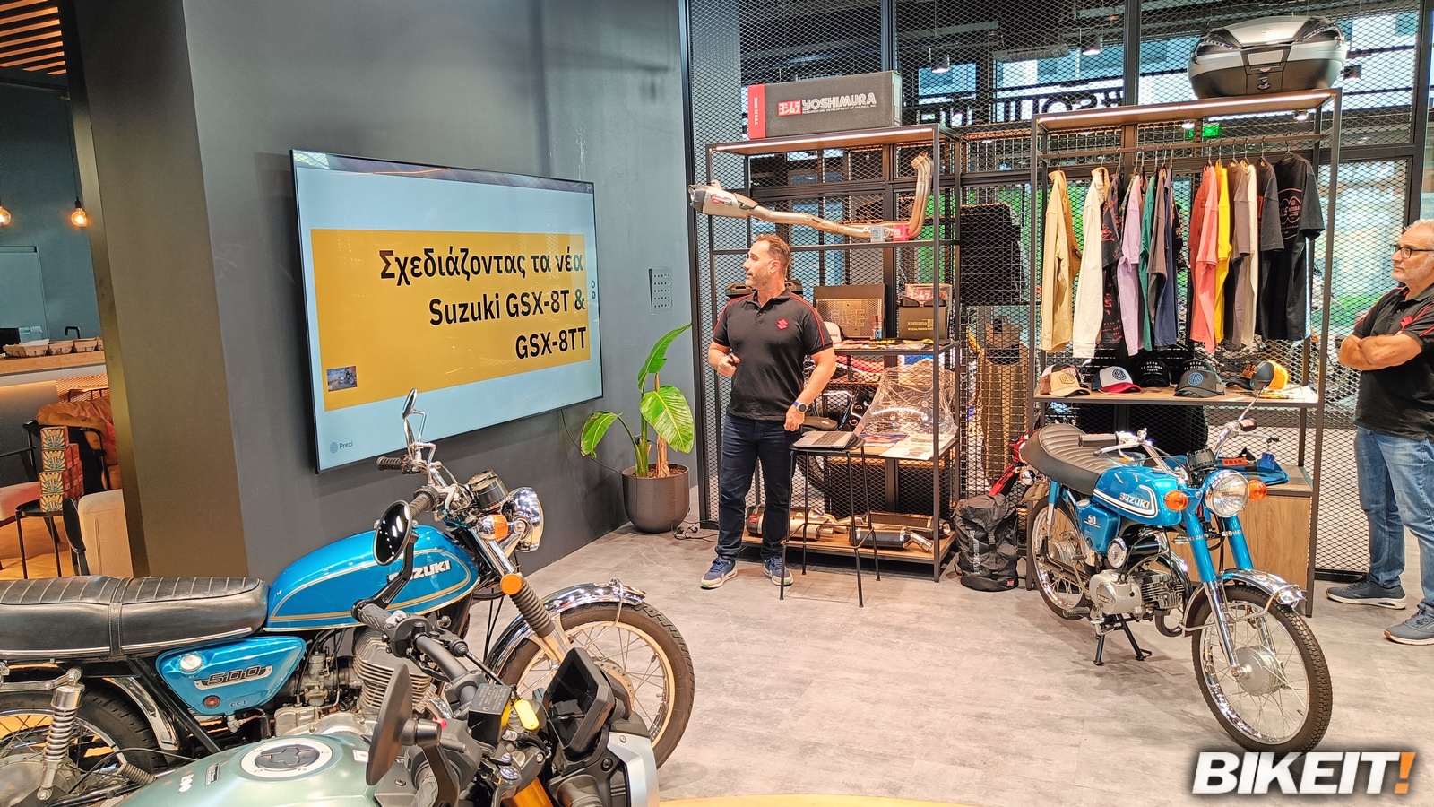 Την παρουσίαση ανέλαβε αρχικά ο κ. Θοδωρής Μαρούλης, γνωρίζοντας μας με την σχεδιαστική ιδιαιτερότητα και ταυτότητα των νέων GSX-8T και GSX-8TT: Διακριτή διαφοροποίηση από τη βάση της πλατφόρμας των GSX-8 στην εμφάνιση, με το GSX-8T να παντρεύει ισορροπημένα τα στοιχεία κλασικού και μοντέρνου, ενώ το GSX-8TT να αποτελεί μία πιο τολμηρή πρόταση με ισχυρότερη αναφορά στο ρετρό και τους αγώνες.